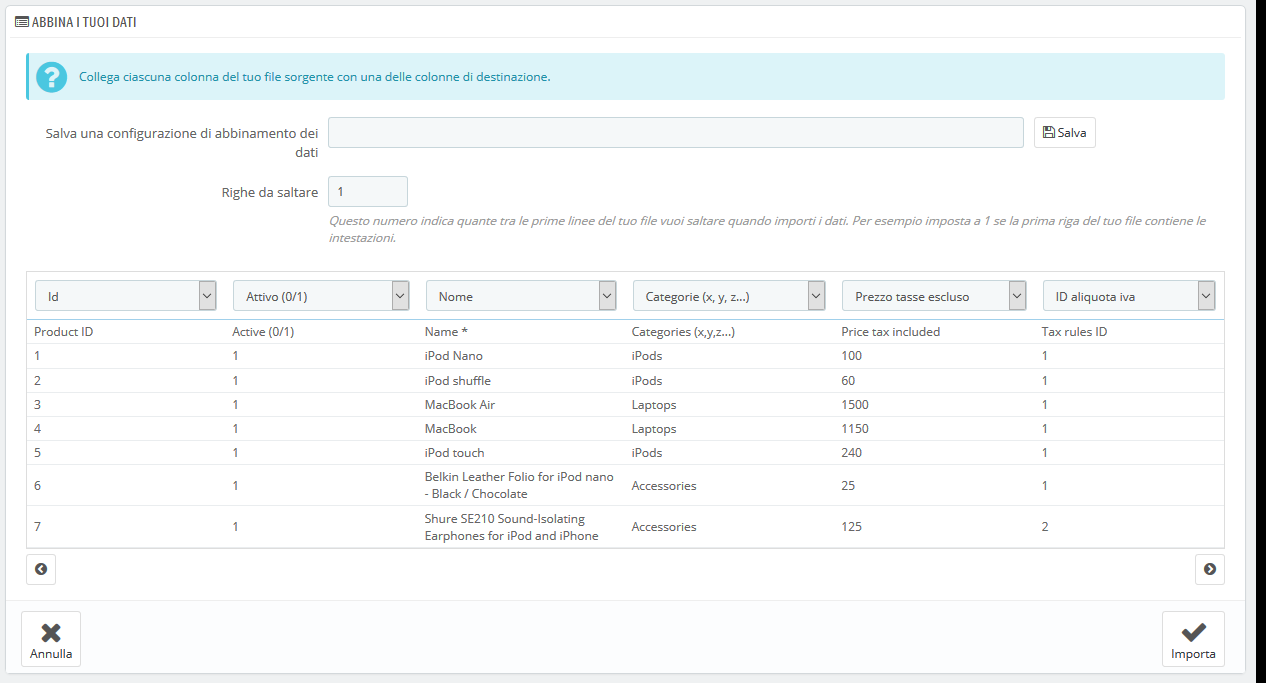 In questa tabella si presentano le righe del tuo file, poste sotto colonne arbitrarie corrispondenti alle esigenze del database di PrestaShop. Sta a te assicurarti che tutte le colonne del file CSV siano abbinate all'intestazione corretta della colonna, utilizzando il selettore a discesa di ciascuna intestazione, in modo da importare correttamente i contenuti.