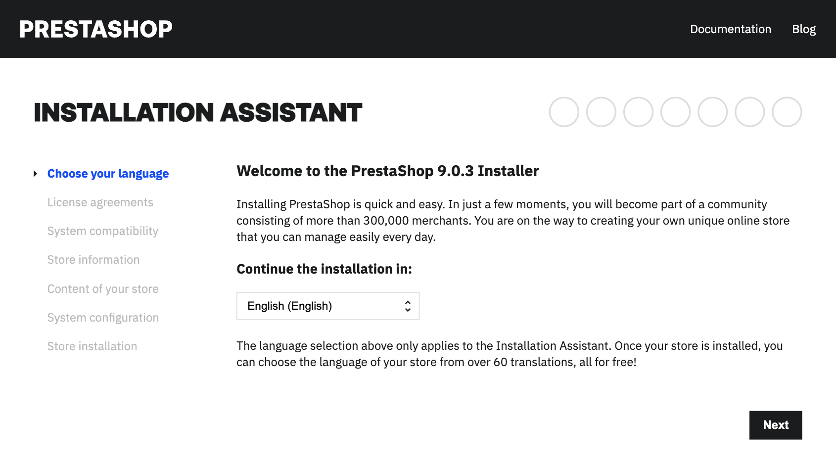 And configure the many settings to suit your tastes and needs. See the user guide's "[First steps with PrestaShop 9](https://docs.prestashop-project.org/v.9-documentation/user-guide/first-steps)" chapter for more information.