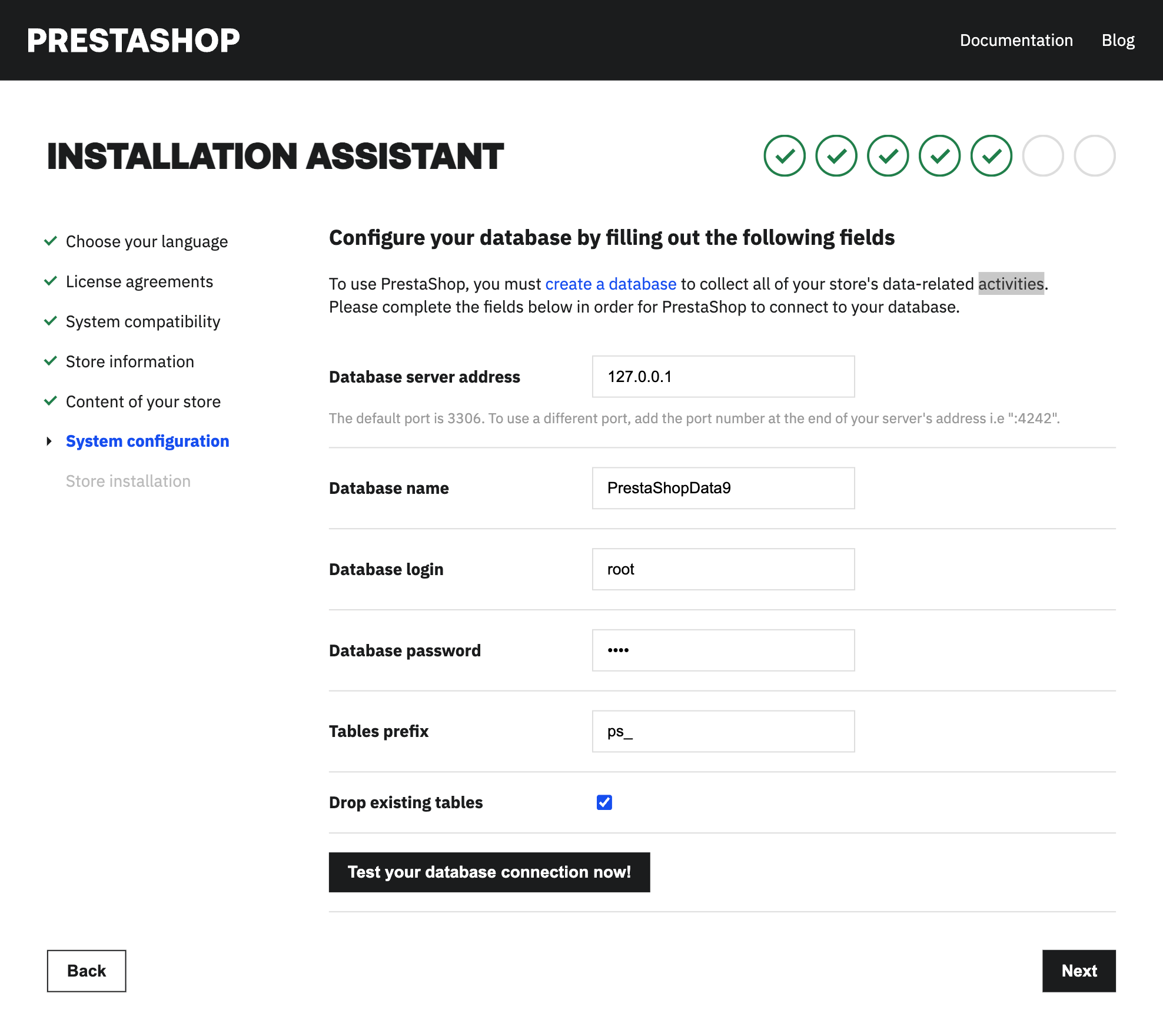 <figure><img src="https://2103090827-files.gitbook.io/~/files/v0/b/gitbook-x-prod.appspot.com/o/spaces%2Ff4jUT8dUfW1PrFTeHOkK%2Fuploads%2FESMLkma26TLiDxMWuoWg%2FStep6PrestaShop9img1.png?alt=media&#x26;token=f5ed8caa-5387-4cab-a9a4-77a99cb34a8f" alt=""><figcaption><p> PrestaShop's Installation Assistant, step 6: Database configuration.</p></figcaption></figure>