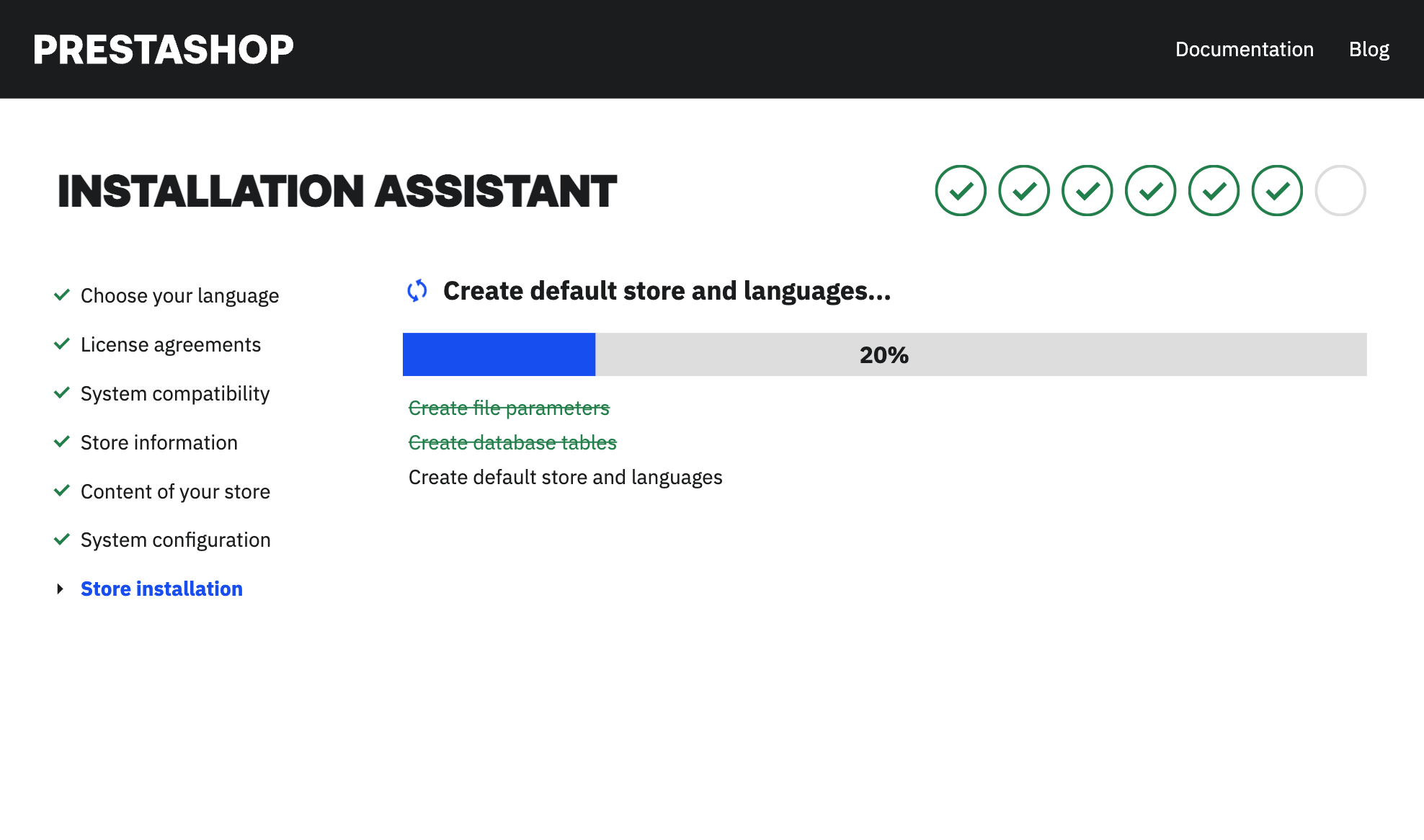 <figure><img src="https://2103090827-files.gitbook.io/~/files/v0/b/gitbook-x-prod.appspot.com/o/spaces%2Ff4jUT8dUfW1PrFTeHOkK%2Fuploads%2FGxgg3TFDvg9Zjb2eTwI4%2FStep6PrestaShop9img2.png?alt=media&#x26;token=89badb2c-a2d6-4d65-af74-59106fdecac0" alt=""><figcaption><p> PrestaShop's Installation Assistant, step 6:  Database tables creation.</p></figcaption></figure>