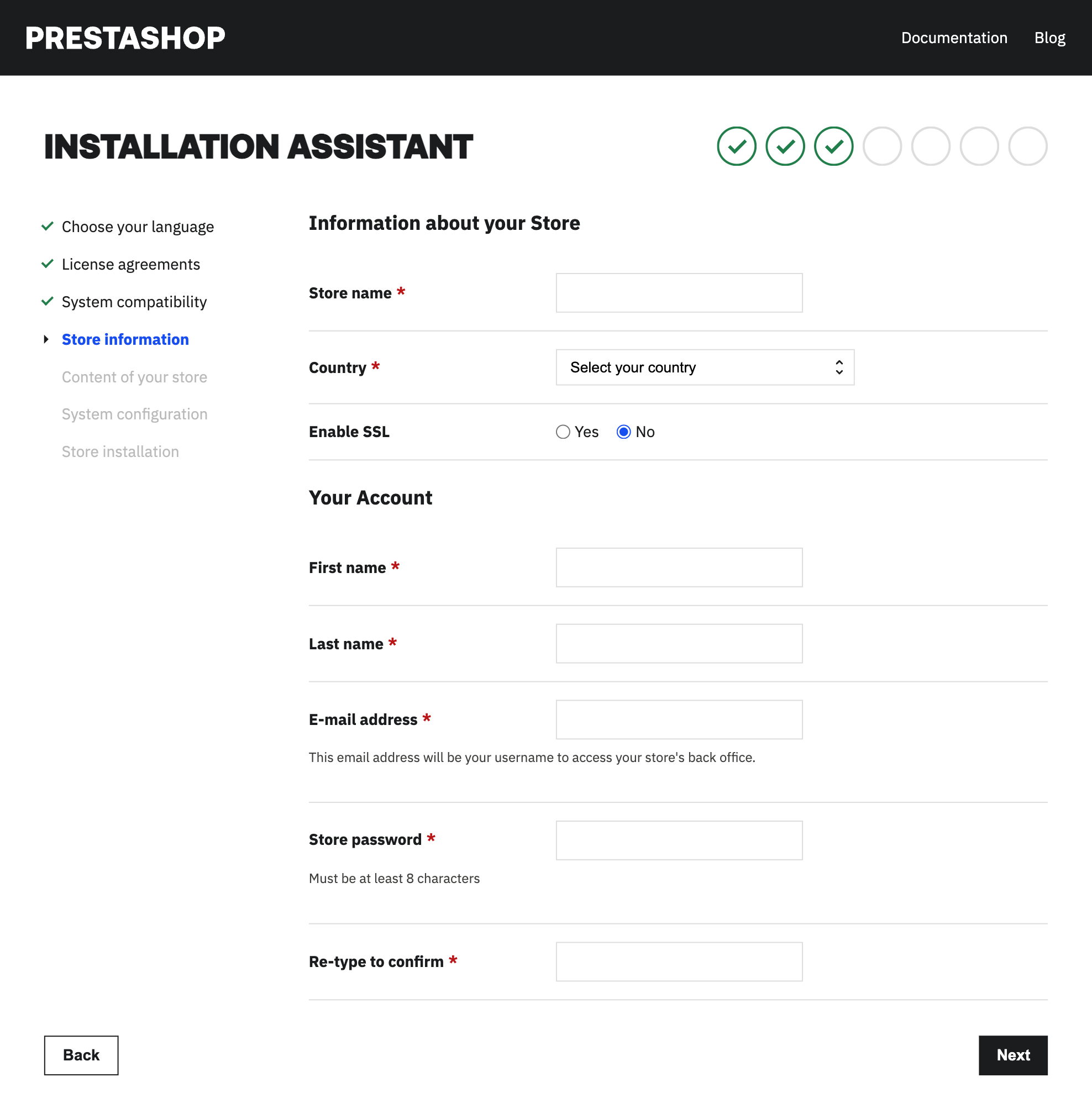 <figure><img src="https://2103090827-files.gitbook.io/~/files/v0/b/gitbook-x-prod.appspot.com/o/spaces%2Ff4jUT8dUfW1PrFTeHOkK%2Fuploads%2FKgRVgvTAy1EtF0ctu5rj%2FStep4PrestaShop9.php.png?alt=media&#x26;token=1ea6a1bc-9e19-4e98-8ba9-f7ff73b31bae" alt=""><figcaption><p> PrestaShop's Installation Assistant, step 4: Information about your Store.</p></figcaption></figure>