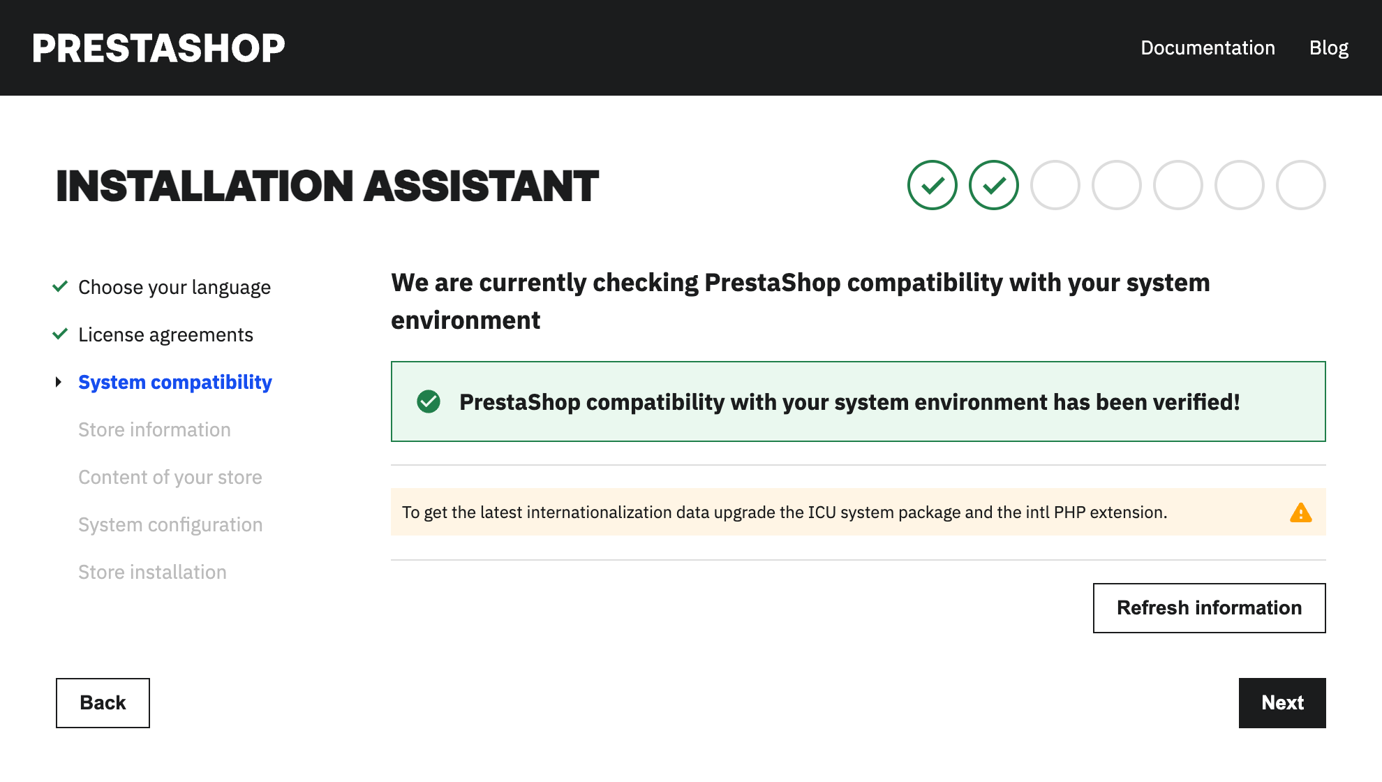 If you cannot have them all green, at least make sure the installer displays the **"PrestaShop compatibility with your system environment has been verified!"** message at the top of the page.