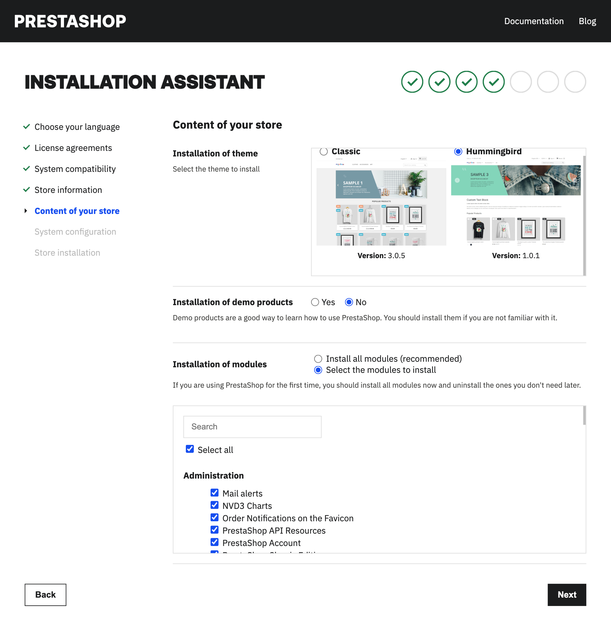 This page provides a form that allows you to choose your theme, which modules to install with your store and opt-in or out of demo products.