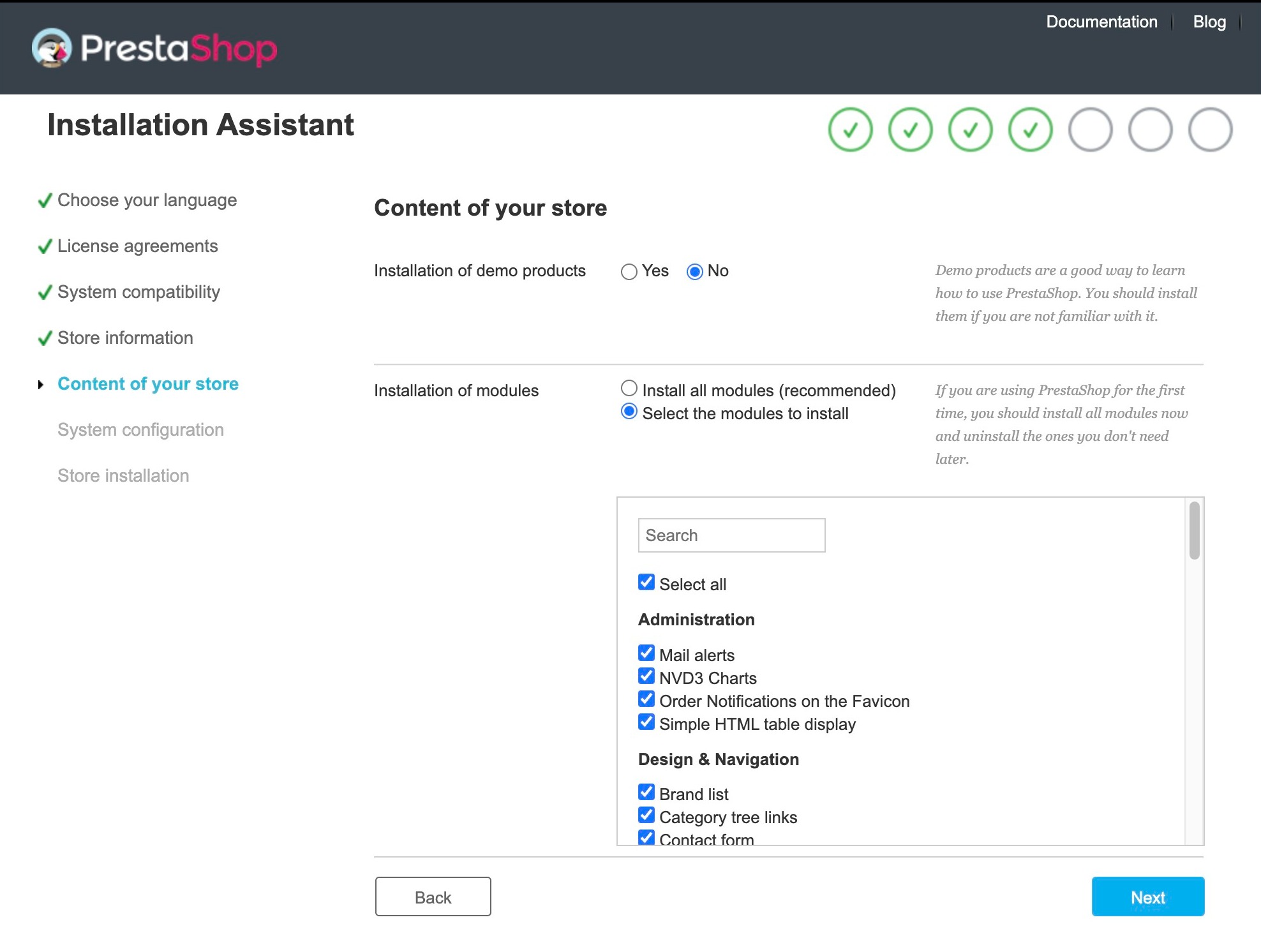 This page provides a form that allows you to choose which modules to install with your store and opt-in or out of demo products.