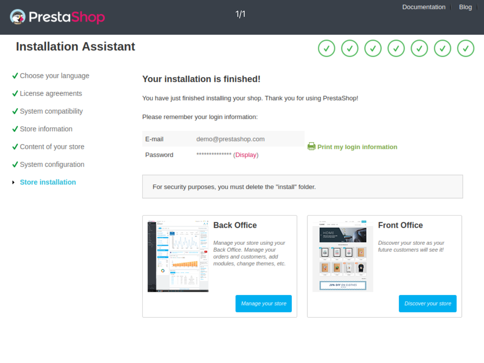 Congratulations, your PrestaShop installation is now complete!