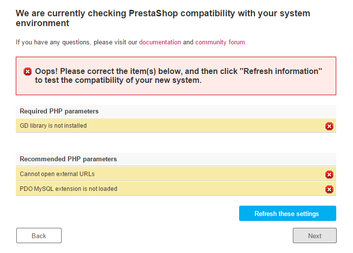 If you cannot have them all green, at least make sure the installer displays the "PrestaShop compatibility with your system environment has been verified!" message at the top of the page.