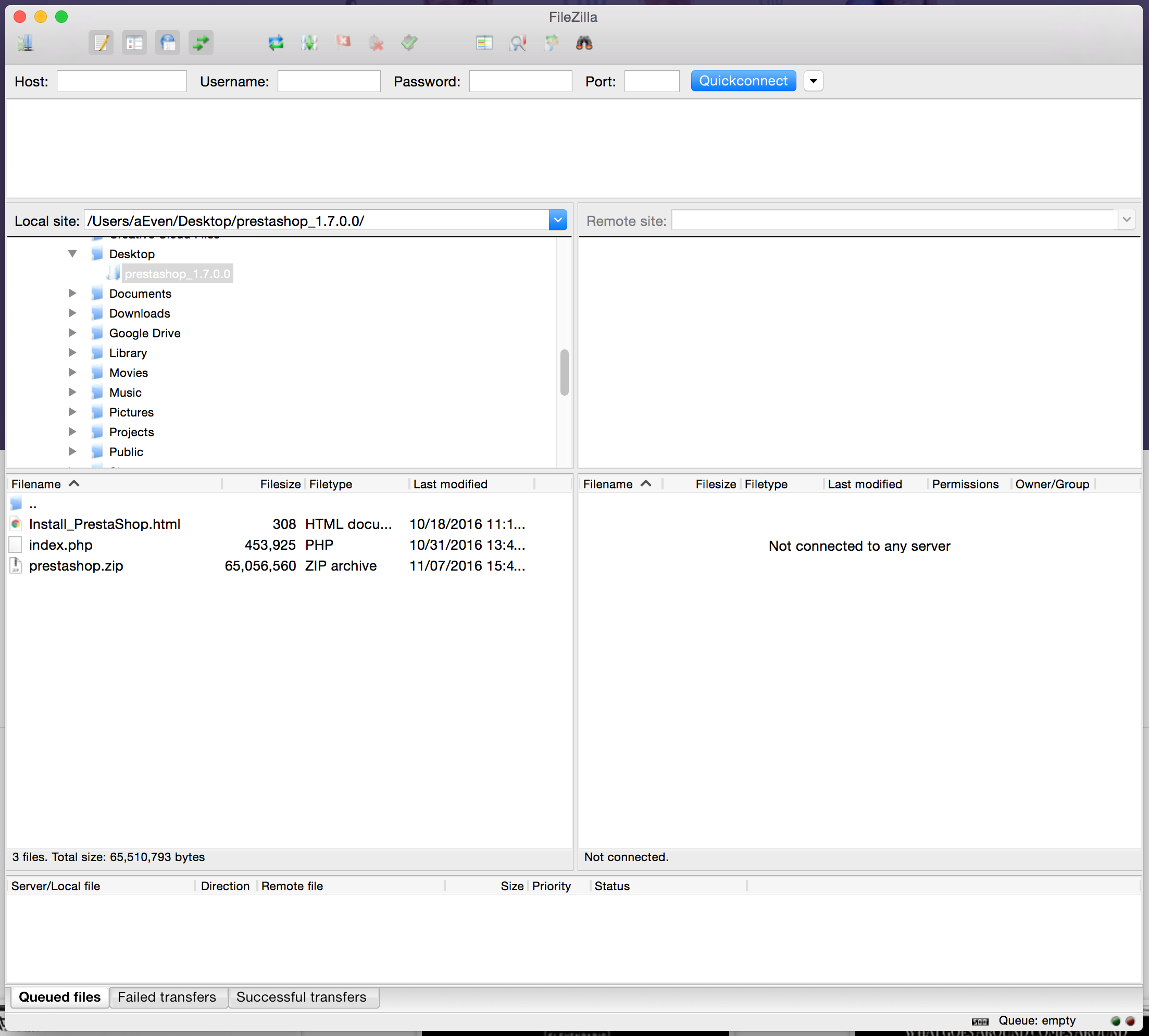 This step helps you upload the PrestaShop files on your hosting space. This is done by connecting your computer to your server using a tool known as an "FTP client", which you should have installed already.