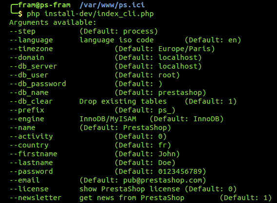 All the options from the regular in-browser installer are available, with their default value listed. Almost all default values can be left as is because you can edit them all from the PrestaShop back office once the installation is done.