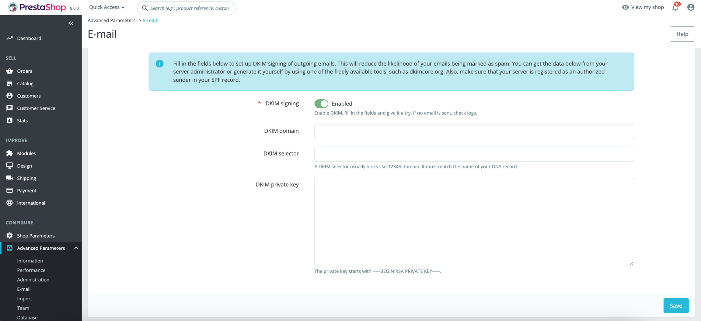 Enabling DKIM signing will open a form, and the DKIM domain, DKIM selector and DKIM private key fields will appear. You will need to manually fill in those fields to set up DKIM signing.