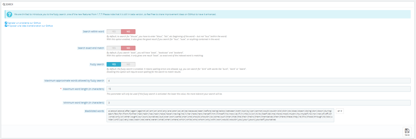 Maximum word length (in characters): This option defines how many characters you allow to run a fuzzy search query. We advise setting the maximum word length at 15 to keep the fuzzy search fast, even when processing long queries. This will not prevent your customers from entering longer words in the search bar, but only the first 15 characters of each word entered will be taken into account for the search. For example, in "thisisaverylongword (19 char.) only "thisisaverylongw" (15 char.) will be taken into account. When modifying the maximum word length, keep in mind that the longer the word (in characters), the more stressed the server is. So, the larger your database is, the more resources a search will consume and the longer it will be.