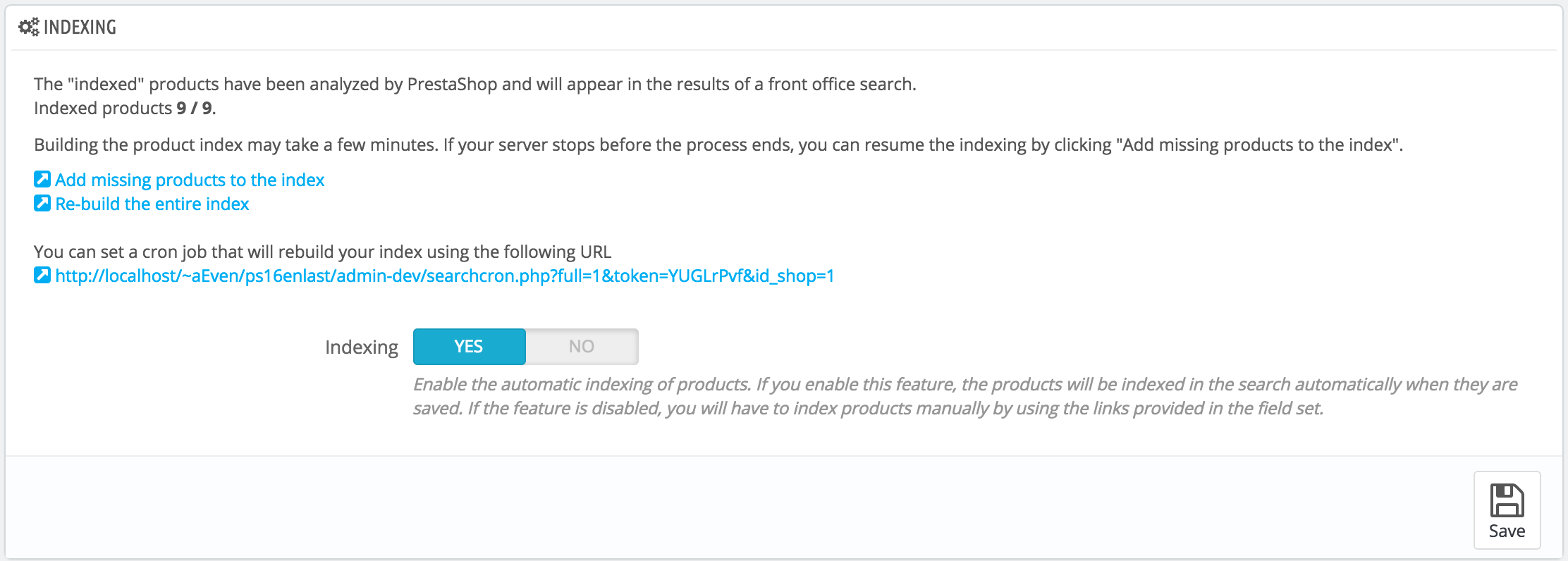 Finally, the "Indexing" option enables you to have a product be indexed as soon as it is created/modified, thus rending the above links and cron link useless.