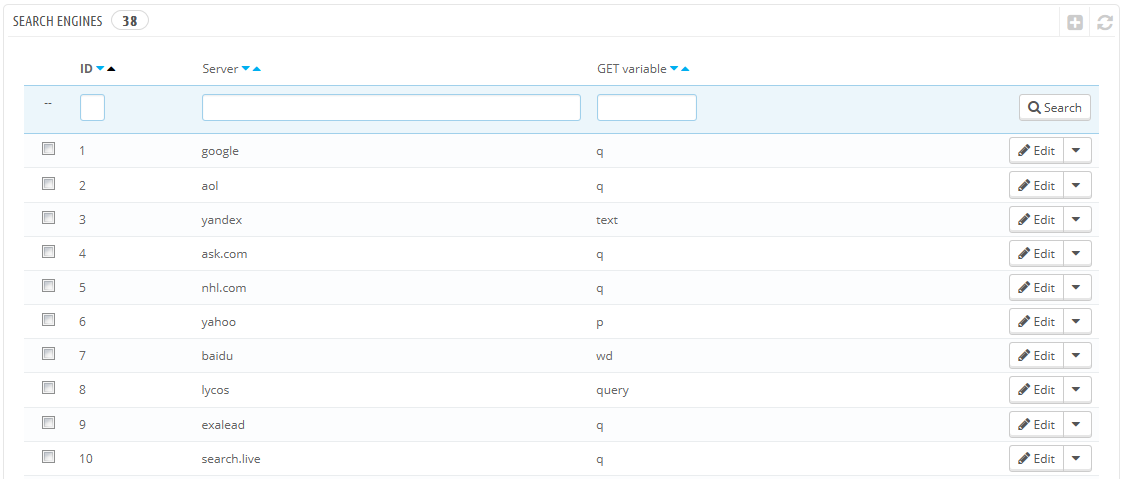This page presents a table of all the search engines that your installation of PrestaShop supports – meaning that PrestaShop is able to recognize it, and to extract the query that the visitor from that given search engine used to find your shop.