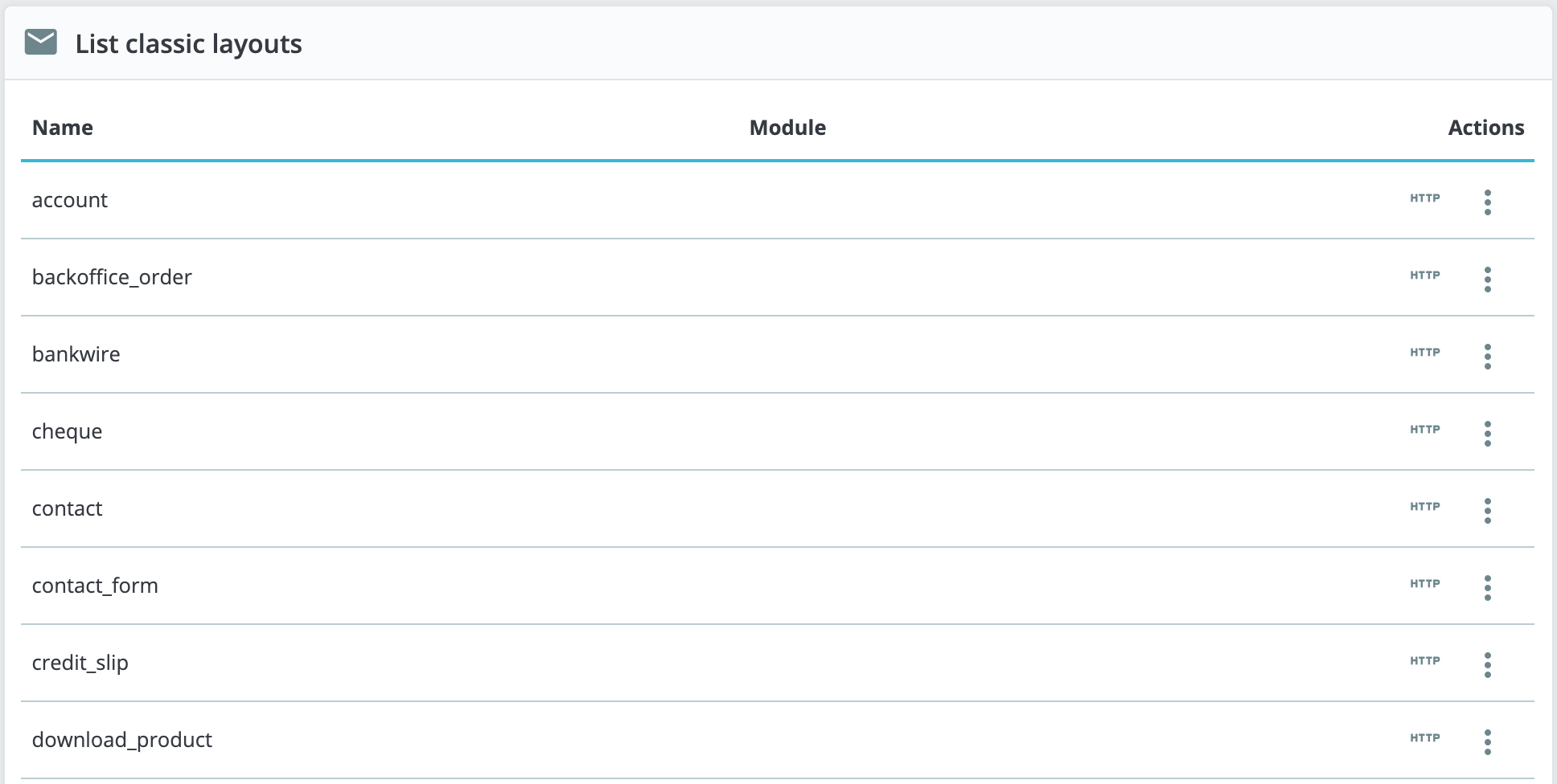 Here, you can find all existing email themes. By default, you already have the two native themes "Classic" and "Modern". Click on the icon to access the full emails list each theme contains. Once on the page, several actions can be performed: