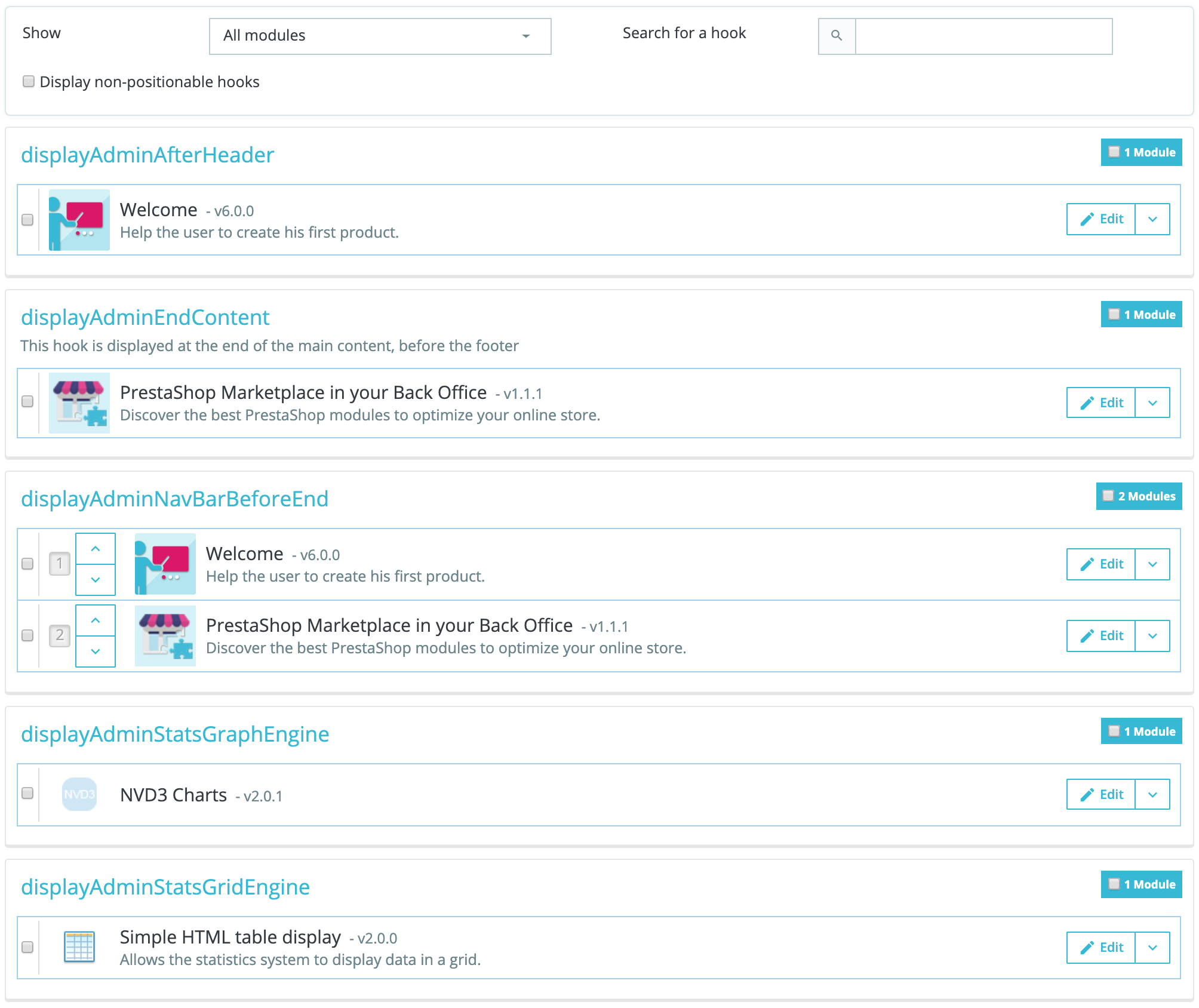 The header of the table for each hook displays the hook's name, a quick description (when available), and its number of attached modules. The table lists the modules that are attached to that hook. The modules are displayed in the order in which they appear in the hook.