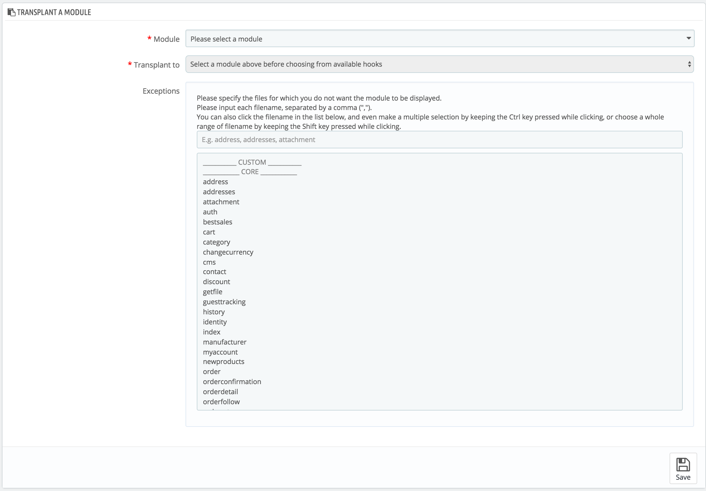In the "Exceptions" field, type the name of the file(s) of the pages in which you do not want the module to appear. You can perform multiple selections simply by clicking on the file names while keeping the Ctrl key pressed. You can deselect files in the same manner: Ctrl+click.