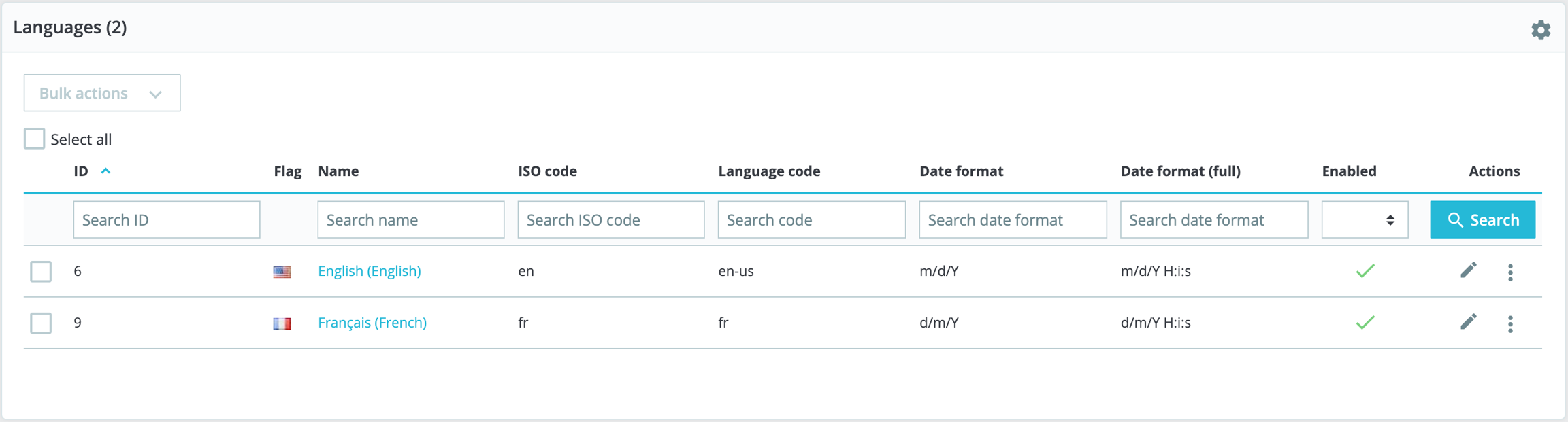 The "Languages" page manages the languages you will see in your administration panel and your shop. The page displays the languages already installed in your shop, along with some information: ISO code, language code, date format (short and full). You can enable or disable a language by clicking on the icon in the "Enabled" column.
