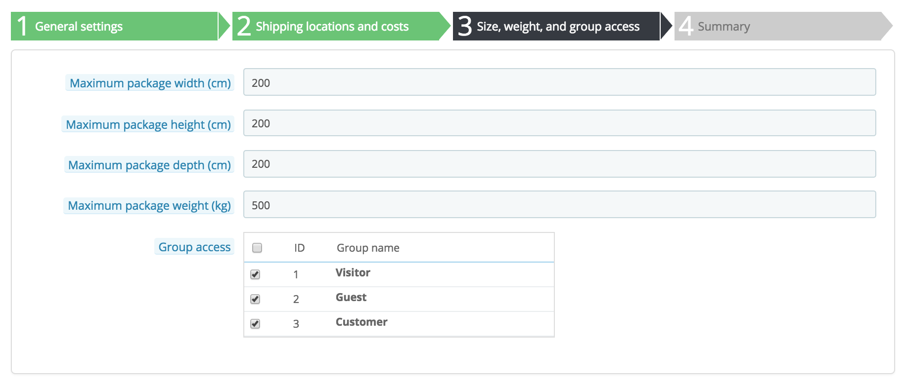 Maximum package height/width/depth/weight. You can now indicate the minimum and maximum package height and weight, which are an essential part of choosing a package carrier. The value is to use the default weight and dimension units, as set in the "Localization" page of the "International" menu.