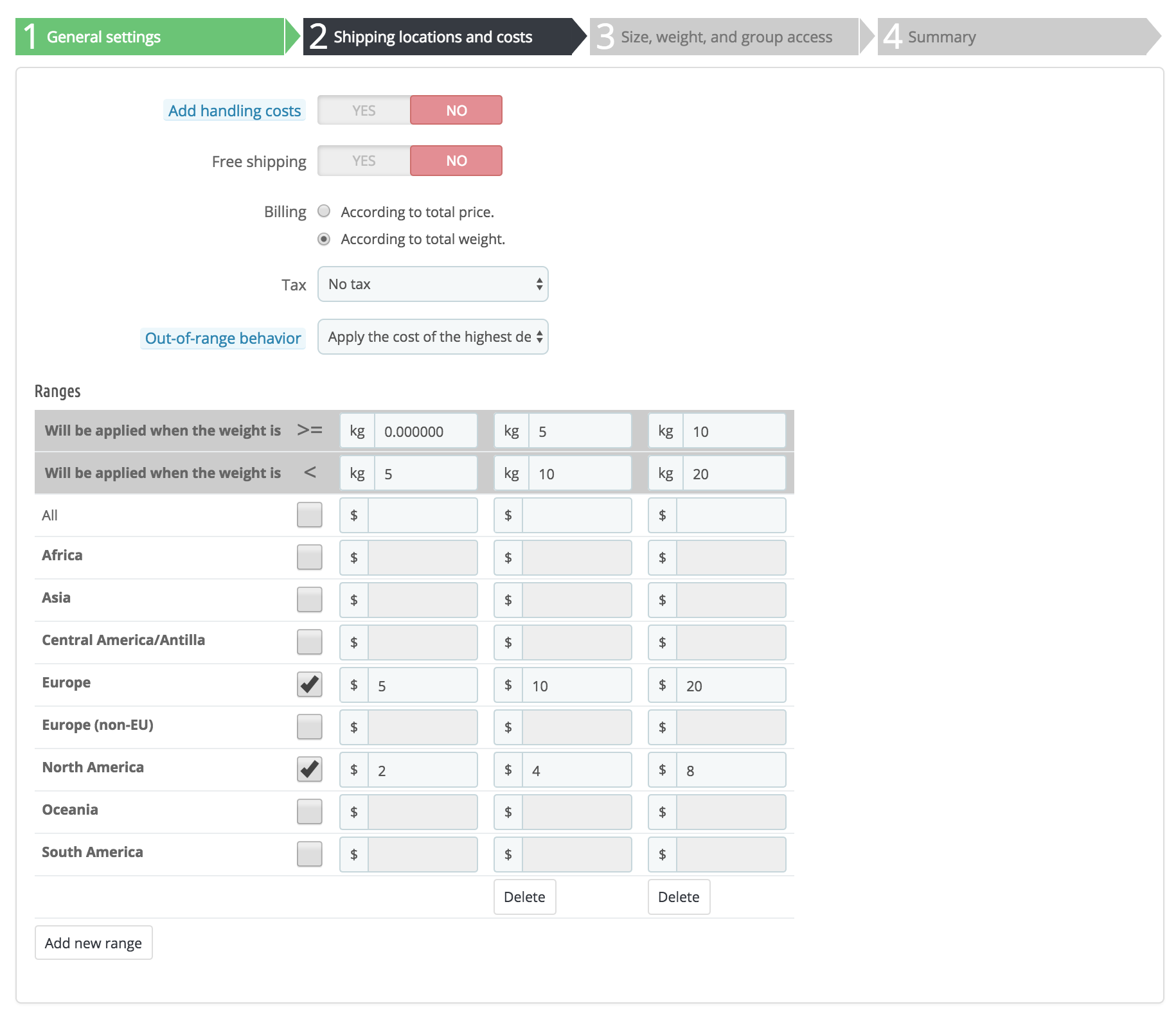 Out-of-range behavior. In case the chosen carrier has not set any shipping cost for the required zone or weight, you can indicate how the software should react. You have two options: