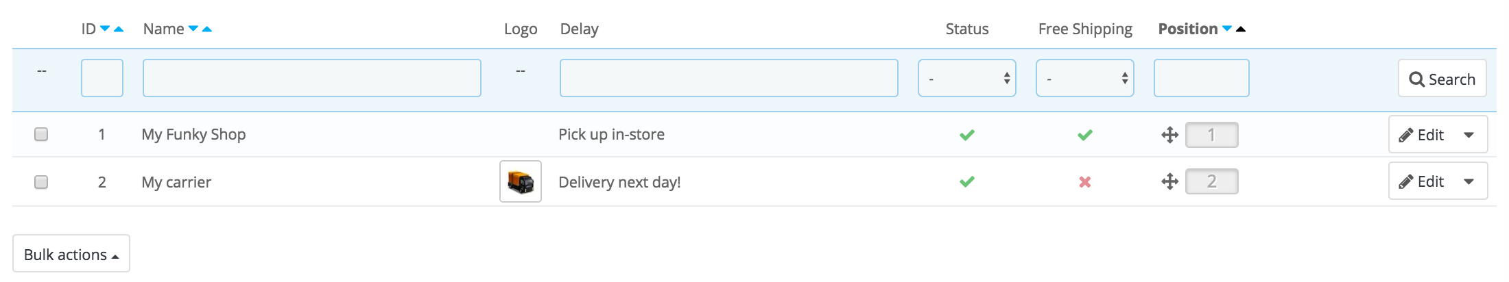 The "Carriers" page presents you with a list of all your current carriers. From there, you can directly change their status, indicate why shipping is free or not, and change their position when presented to customers.