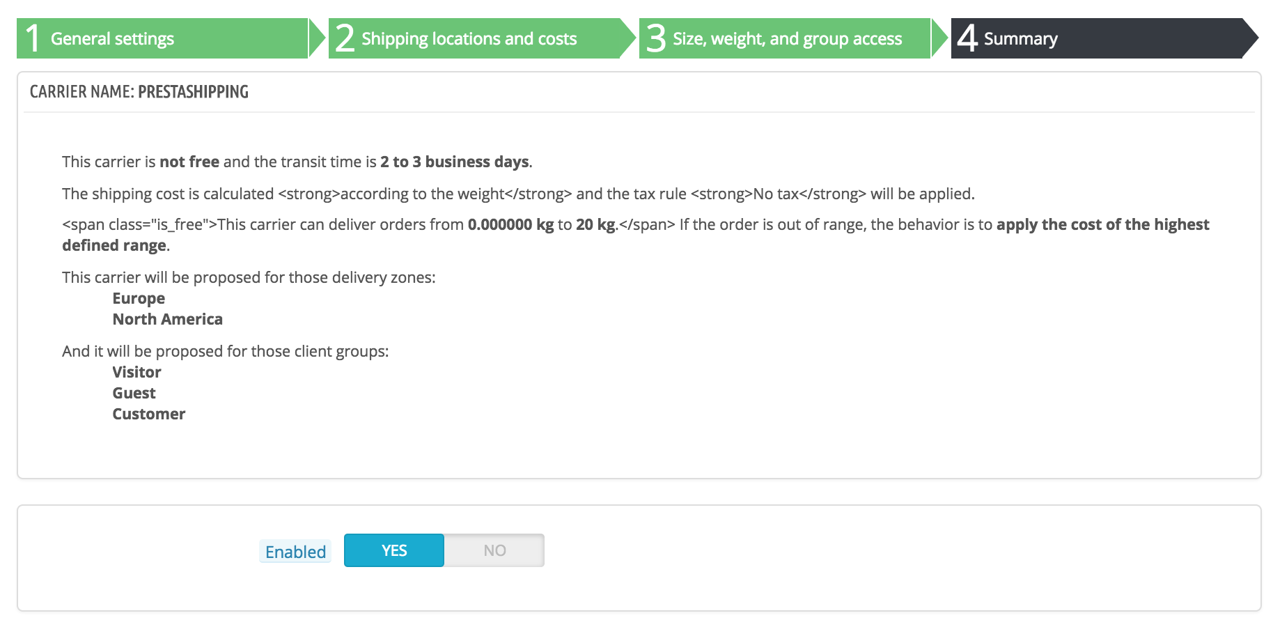 If some settings are wrong, you can go back to any previous panel by either using the "Previous" button or directly clicking on the panel's tab. If you want to save this carrier as a draft for now, then come back to it later, disable the carrier using the "Enabled" option at the bottom of this final panel. Either way, click on the "Finish" button to save your work, and create the carrier.