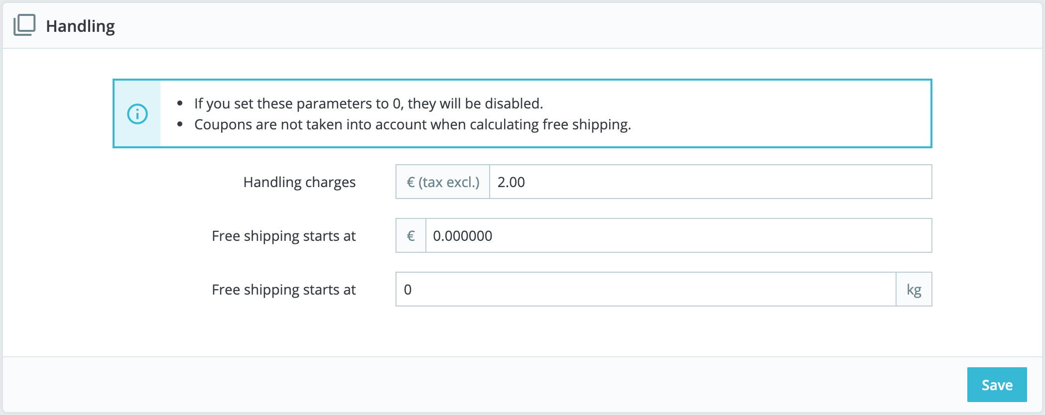 The more general settings of your shop's shipping configuration are found in the "Preferences" page, under the "Shipping" menu. This page provides handling charges settings: