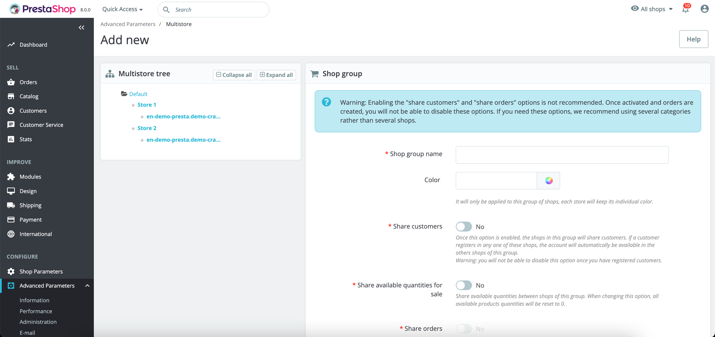 To add a new group of stores, go to the Advanced Parameters > Multistore page, click on the "Add a new shop group" button, and fill in the form.