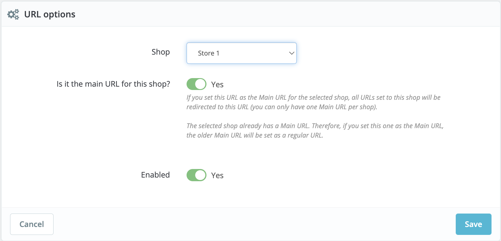 Main URL: Switch the button to "Yes" if you want all the URLs of the store to redirect to the main URL.
