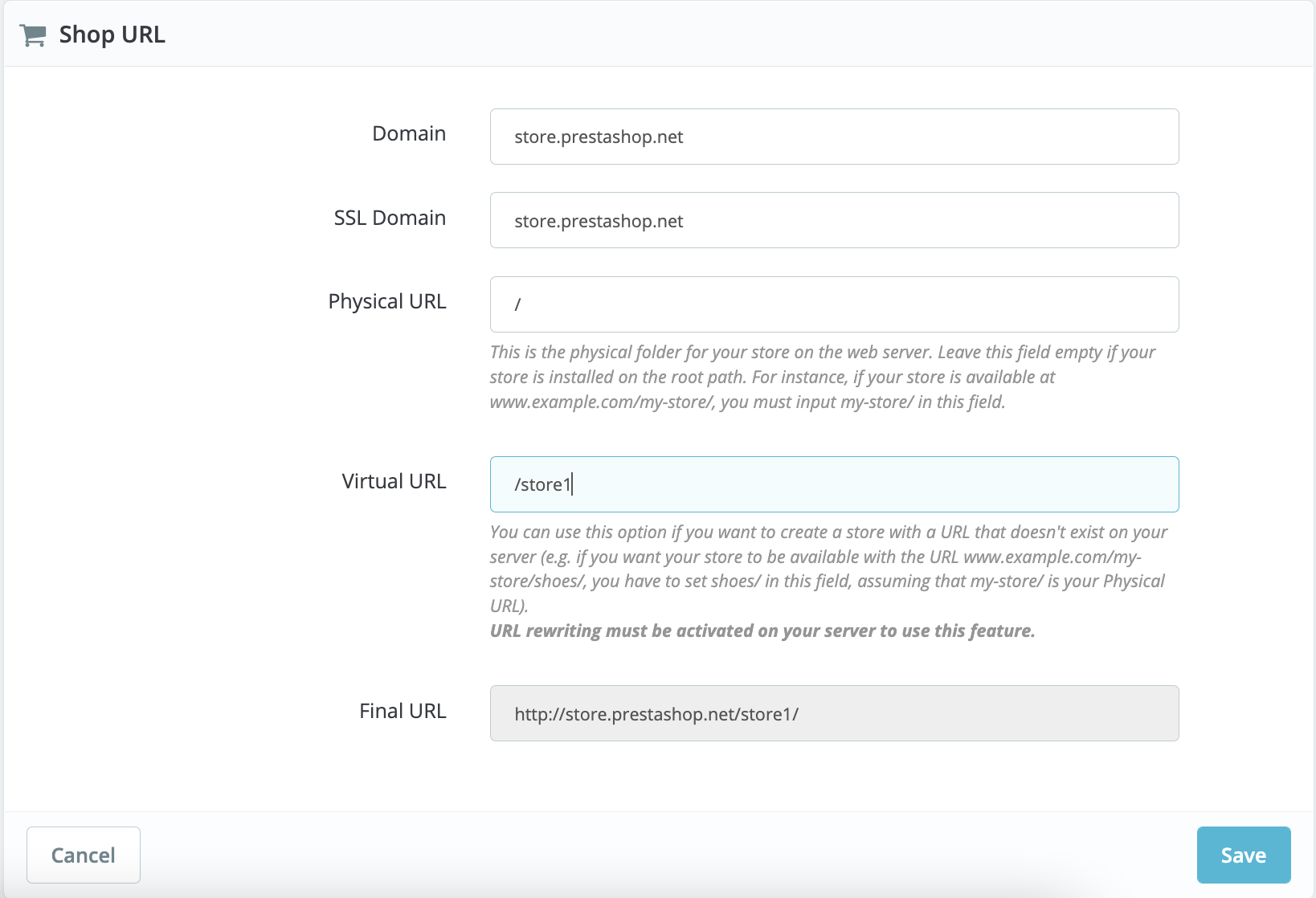 /. Alternatively, if you installed your store in a sub-folder, the physical URL is the name of the subfolder.Virtual URL: Thanks to URL rewriting, you can use this option if you want to create a store with a URL that doesn't exist on your server, without having to create a sub-folder. For example, if you want your store to be available with the URL