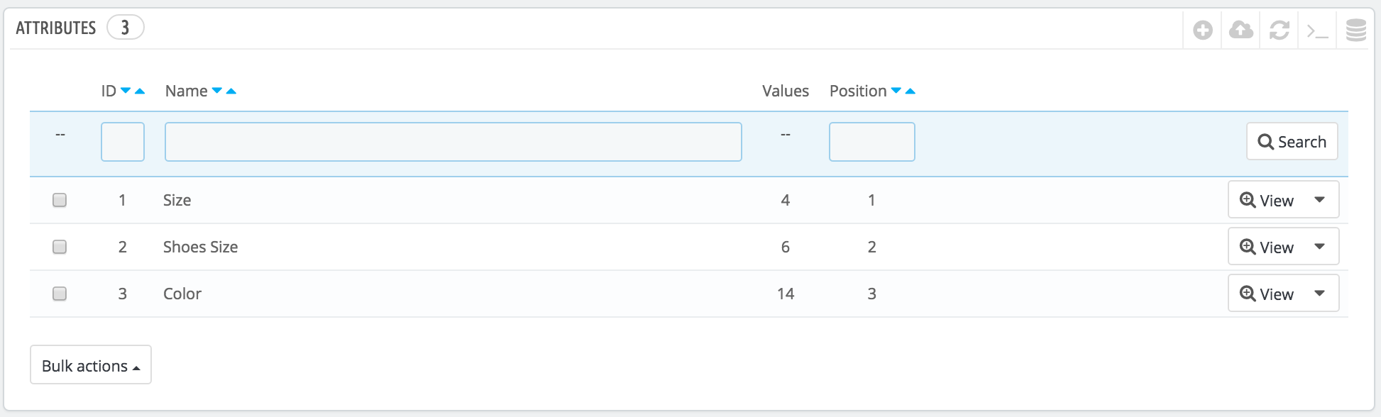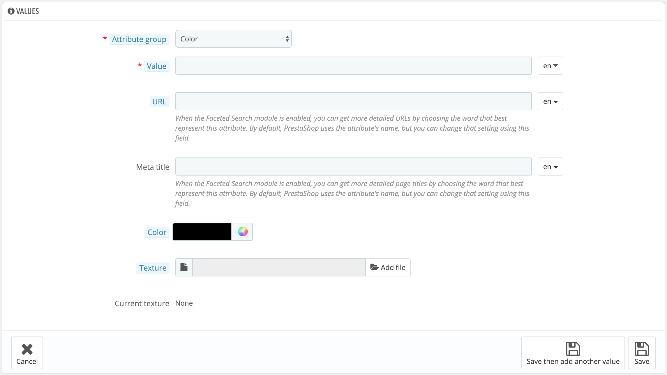 You can add more values for the same attribute type by saving your changes with the "Save then add another value" button. Once your attributes are in place and their values are set, you can create product variations (or "combinations") in each product's "Combinations" tab, from the "Products" page under the "Catalog" menu.