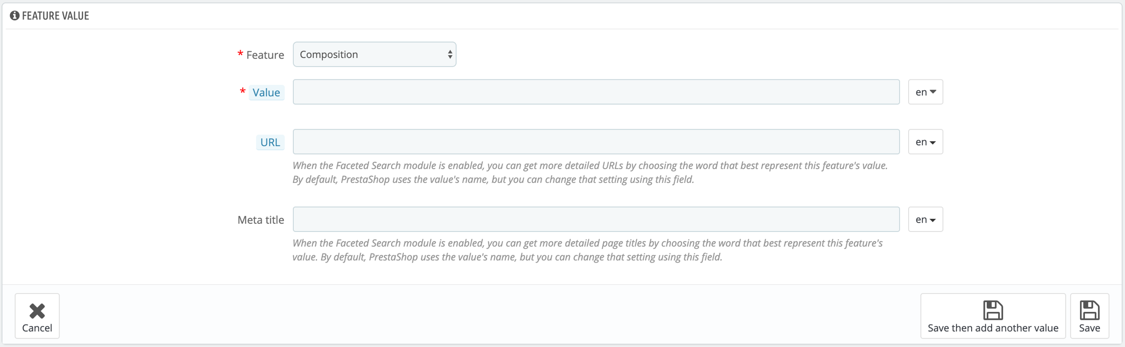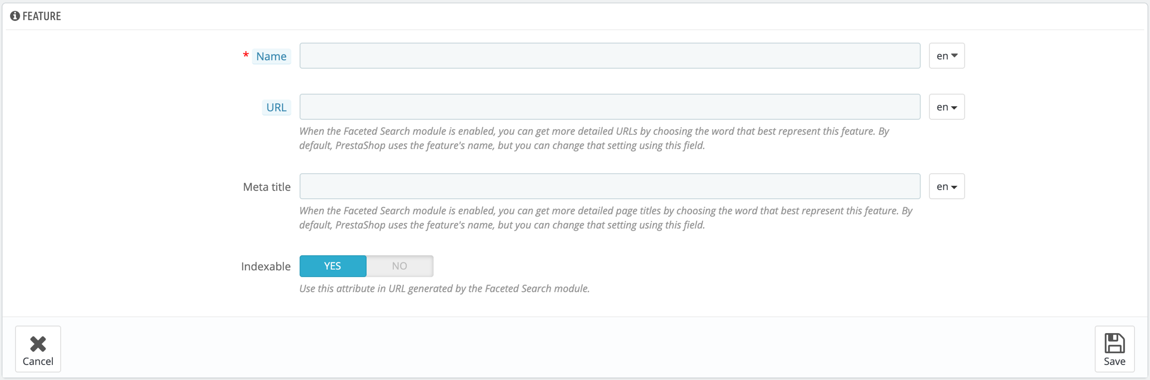 Give a name to this new feature, an URL and define its meta title. If you want to make this feature available for the Faceted Search module, select its indexation. Save your new feature to return to the attributes list.