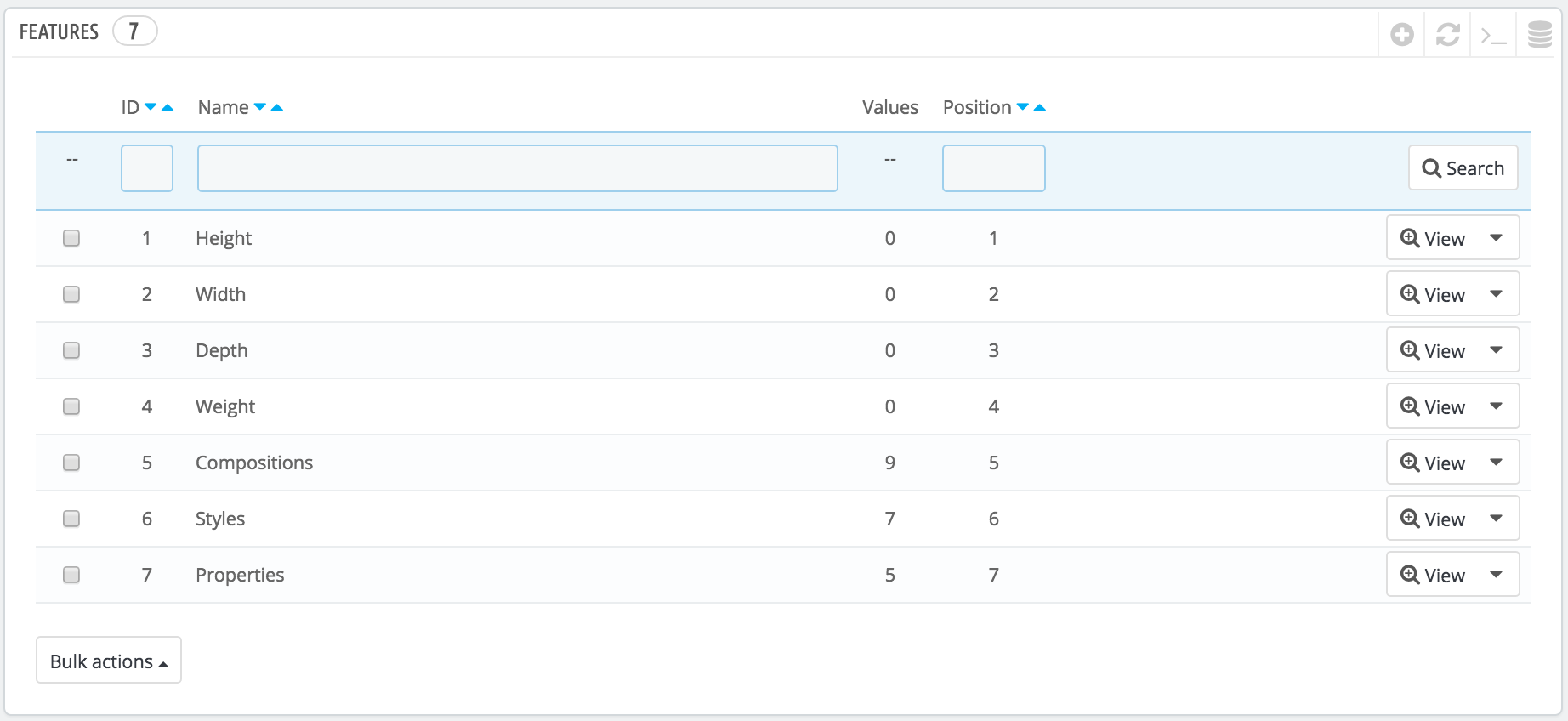 You can set the features' order using the arrows in the "Position" column. The "Actions" column gives an Edit action, a Delete action and a View action which you can click to display the available values for this feature. From there, you can sort, edit and delete values if you need to.