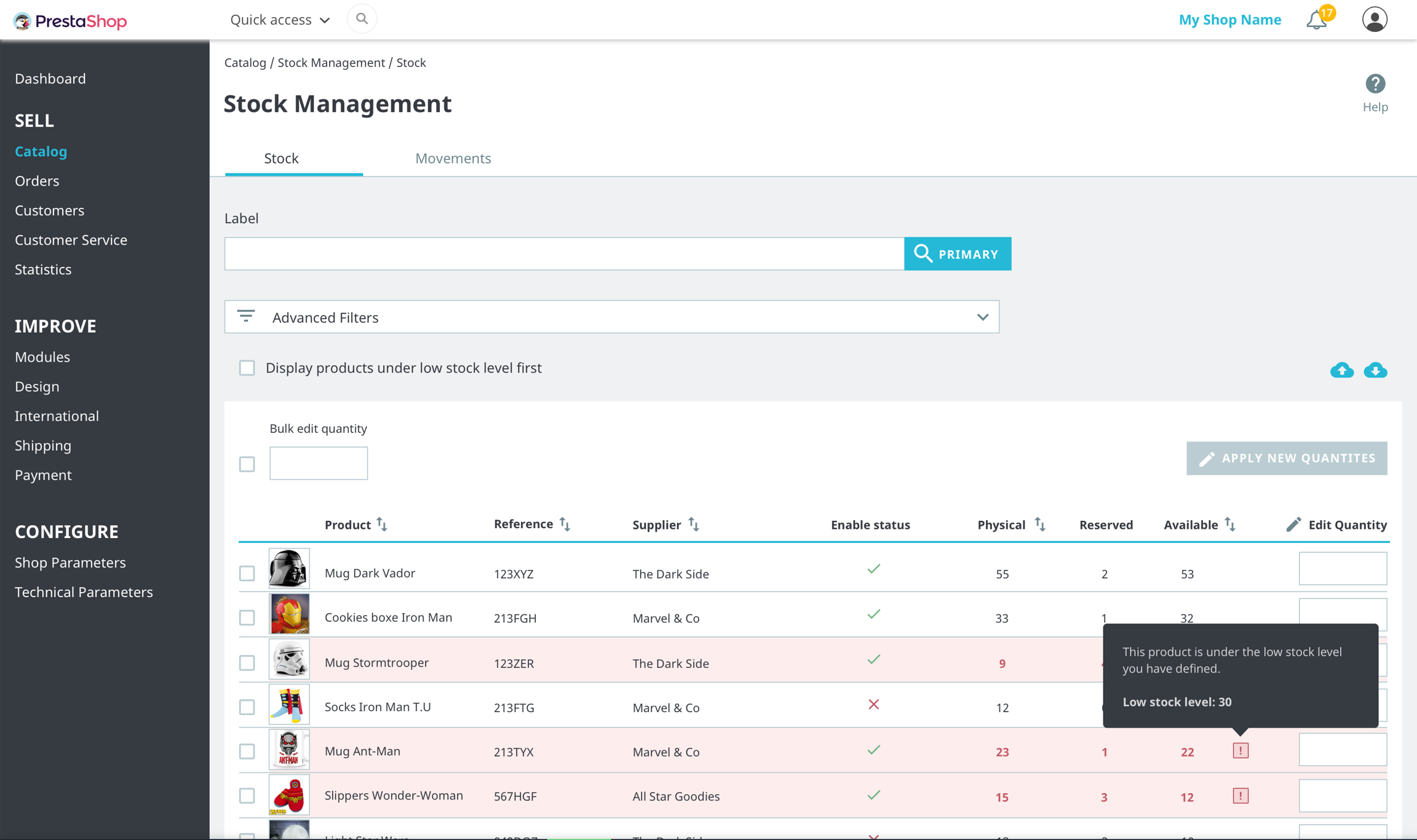Also, when a product is low on stock, you can ask PrestaShop to send you alerts. You can configure the low stock threshold as well as toggling the notification either globally in the "Product" page or per product. And then, in this stock overview page, products with a quantity under the low stock level are now highlighted. A quick filter has been added too, which allows you to quickly see products low on stock by placing them at the top of the list.