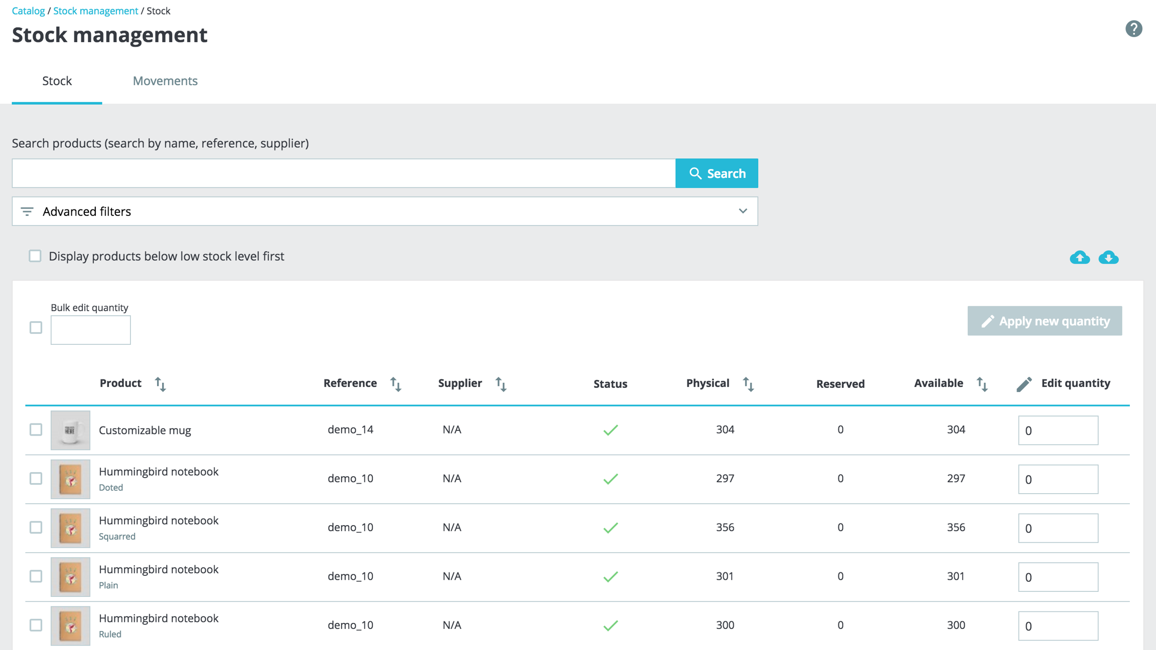 This tab contains a table presenting your products' stock, as well as search options and allows you to directly edit your products' quantities.