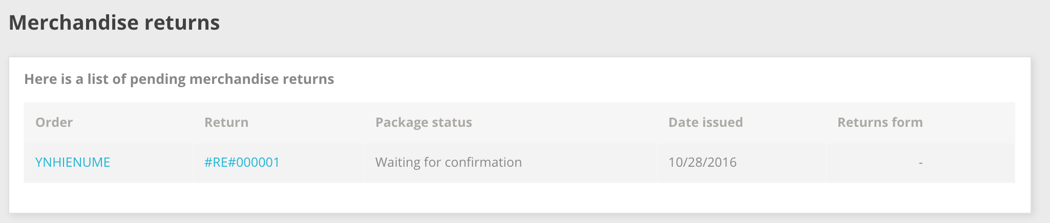 Once the form is complete, the customer clicks on "Request a return", and the request is sent to the store manager (you). The request appears as "Waiting for confirmation" in the customer's "Merchandise Returns" page, accessible from the account page.