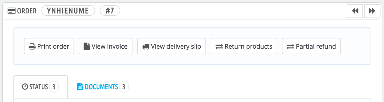 An order can be refunded, either partially or totally. This is done using two actions buttons located in the top bar of the order's page itself rather than in the return page.