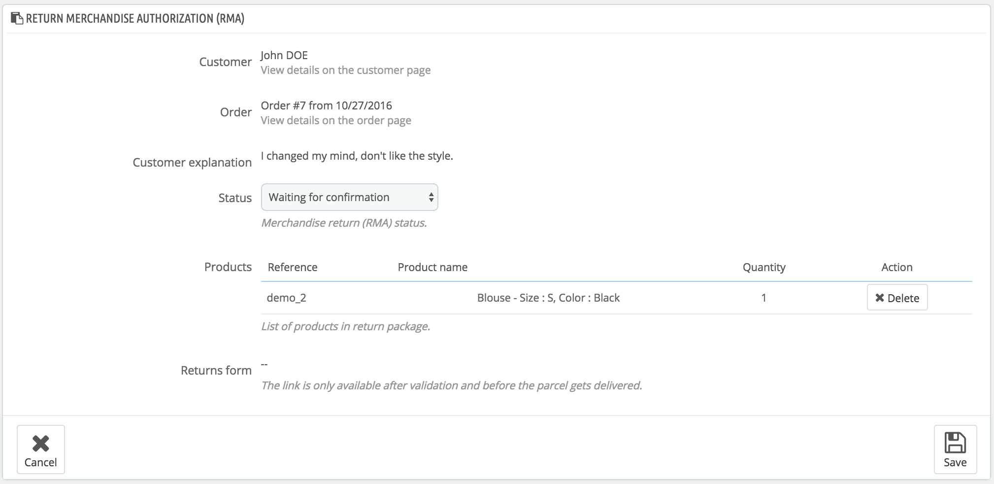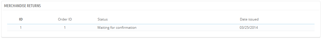 The return request appears in your back office in the "Merchandise Returns" page. At first, the return request has the "Waiting for confirmation" status.