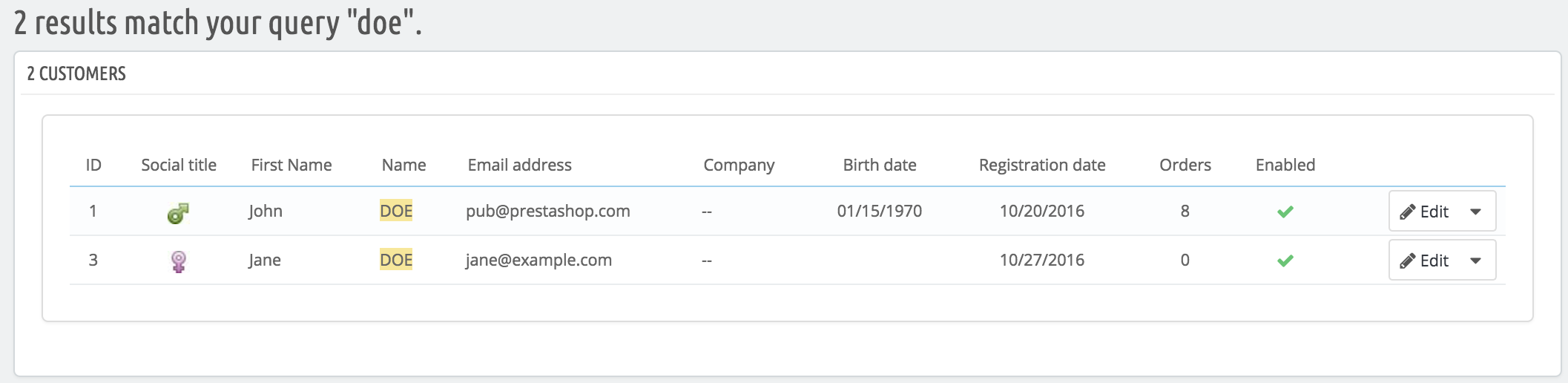 The results, if any, are then presented: the list presents you with the users' ID, social title, email, birth date, registration date, amount of orders and whether or not the user's account is active. From there on, you can view the whole user's page, or edit its details.