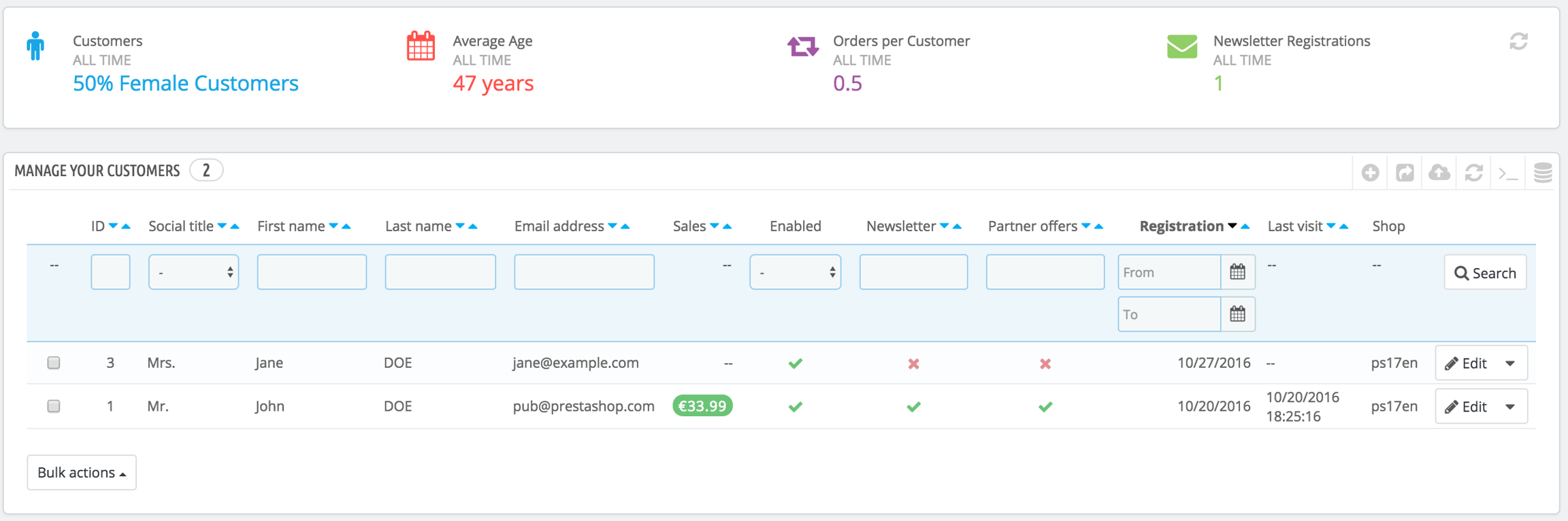 The first page under the "Customers" menu gives you a list of all the registered users on your shop.