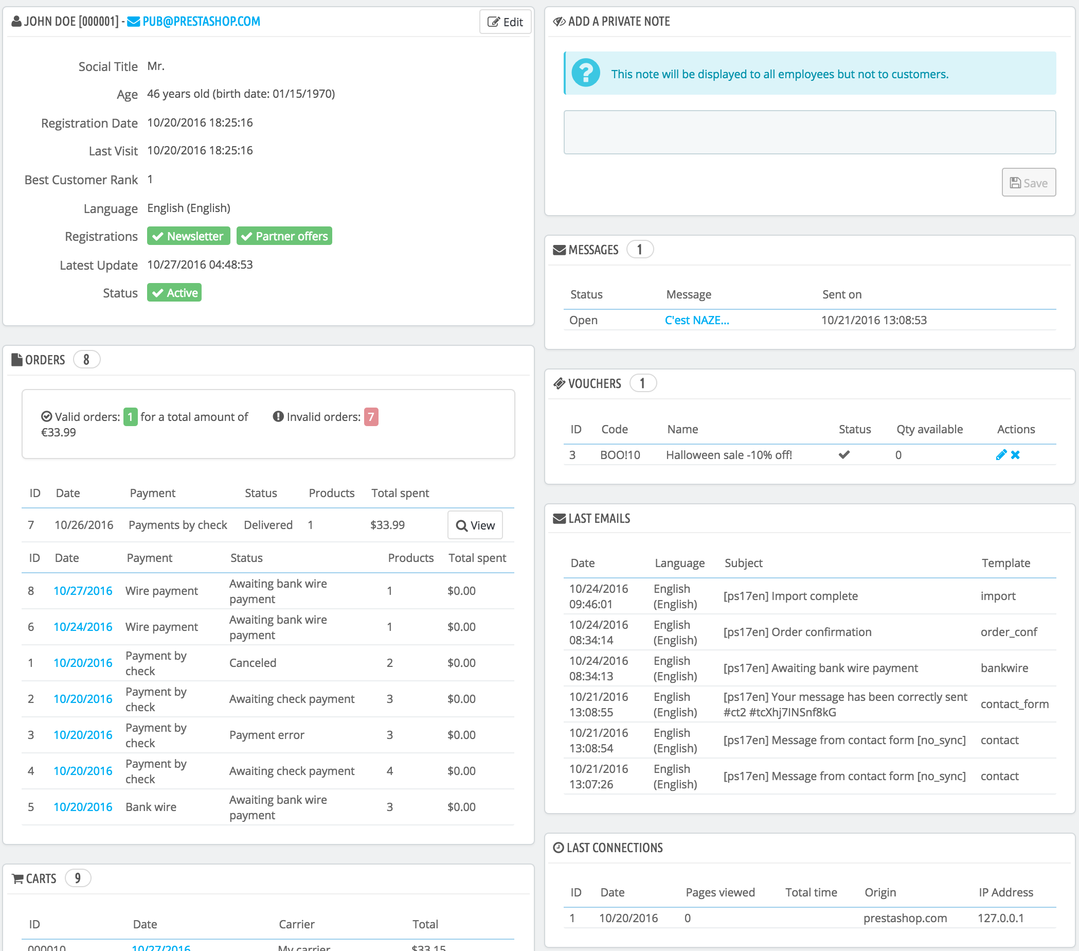 When installed for the first time with sample data, PrestaShop has a default user, named John DOE.