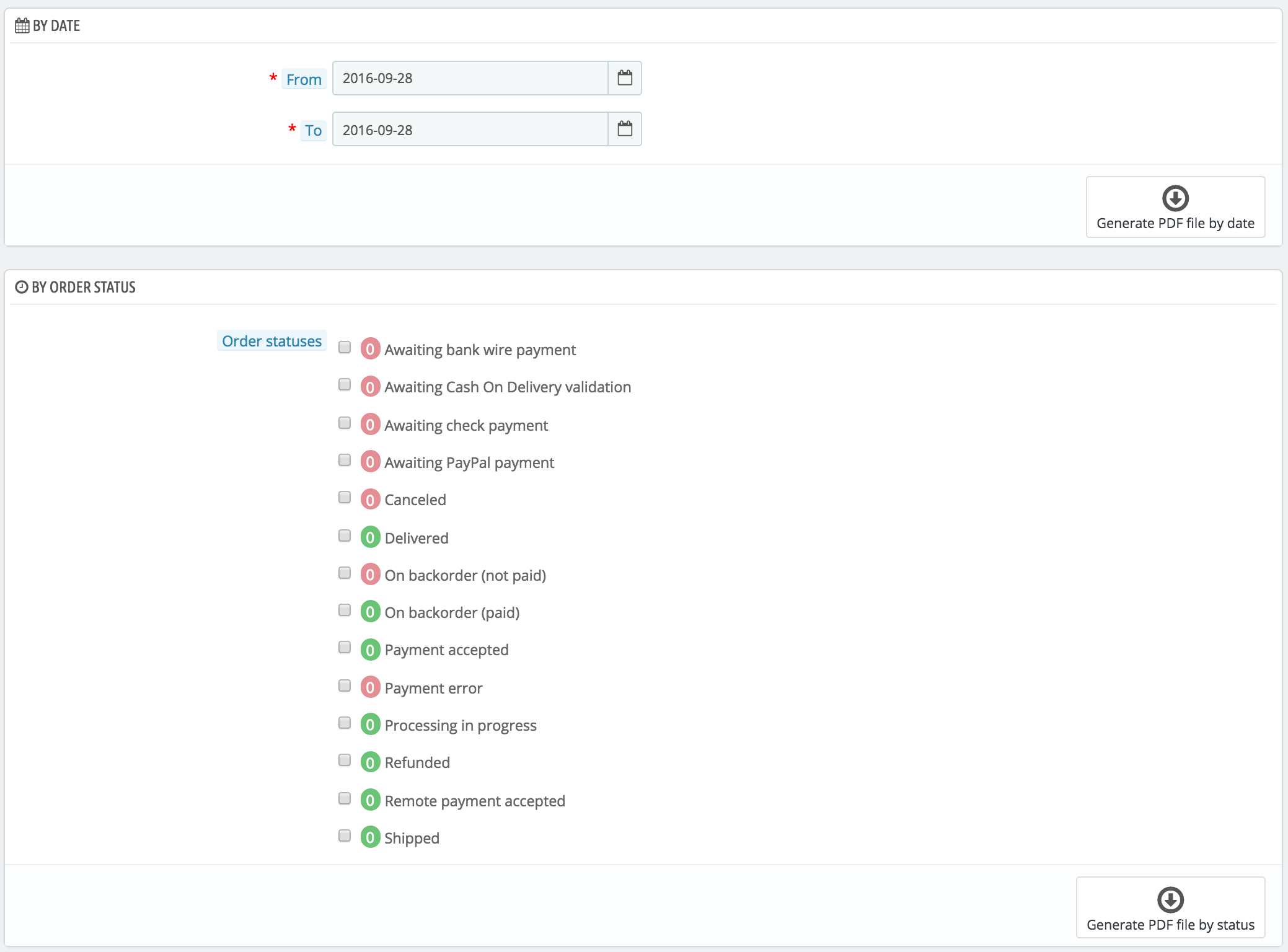 By order status. A must-have when you need to print precisely which orders are canceled, refunded or on backorder. PrestaShop helpfully indicates the number of invoices tied to each status in parentheses.
