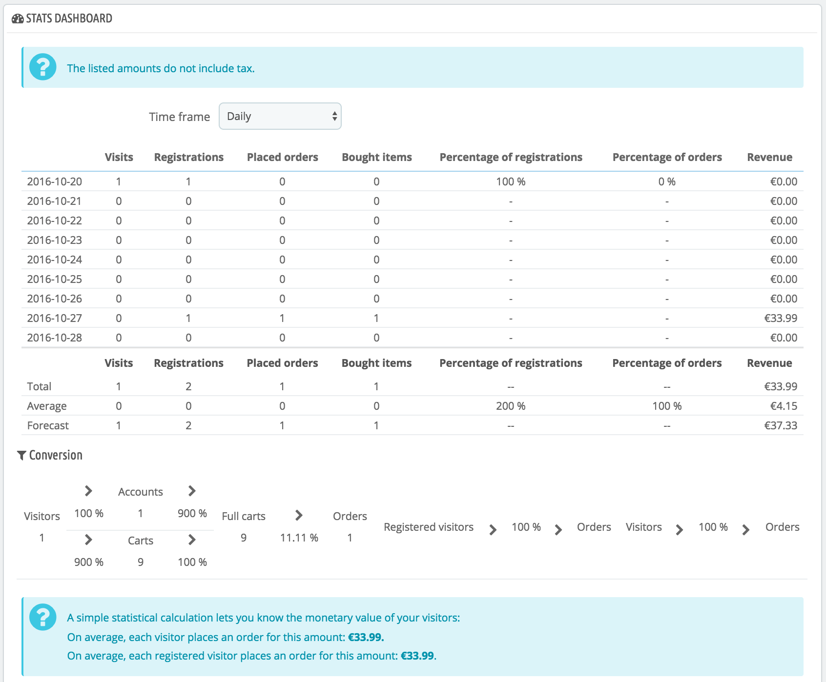 The main statistics. This truly is the heart of your statistics. Within a single table, PrestaShop gives an overview of the most important numbers that were gathered for the selected period of time: visitors, new registrations, new orders, number of items bought for all orders combined, percentage of registration per visitors, percentage of orders per visitors, amount of used coupons, amount of all sales combined. You can change the granularity using the drop-down selector, at the top right of the section. The available period sizes are: daily, weekly, monthly, and yearly. The three lines at the bottom of the table are not affected by the selected period: total, average and forecast figures enable you to get a better estimate of where your shop is heading to.